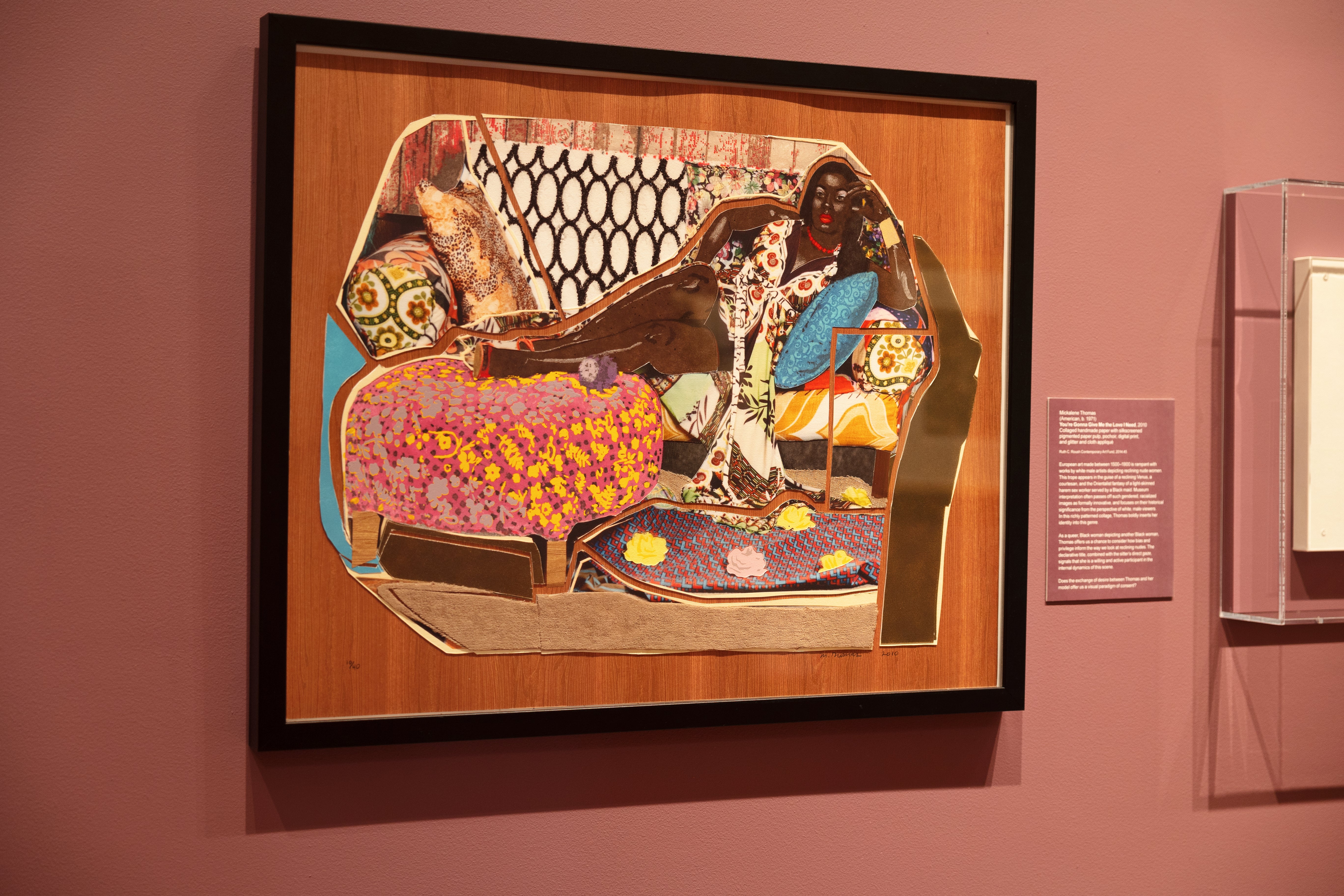The exhibition’s labels add intriguing context. The one for Thomas’ piece, which depicts a Black woman reclining on a colorful backdrop that mixes and matches patterns and textures, reads: “As a queer, Black woman depicting another Black woman, Thomas offers us a chance to consider how bias and privilege inform the way we look at reclining nudes. The declarative title, combined with the sitter’s direct gaze, signals that she is a willing and active participant in the internal dynamics of this scene.”