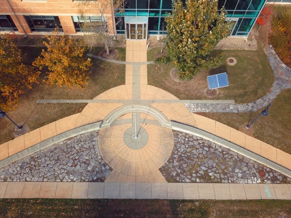 The Lyle Sun Plaza is named for the late John Lyle, a landscape architect who was one of the principal members of the AJLC design team. The plaza, located on the center’s south side, features a gnomon and colored cement arcs that comprise a seasonal sundial. As the sun’s position changes throughout the year, the gnomon shadow follows particular arcs that mark the solstices and equinoxes.
