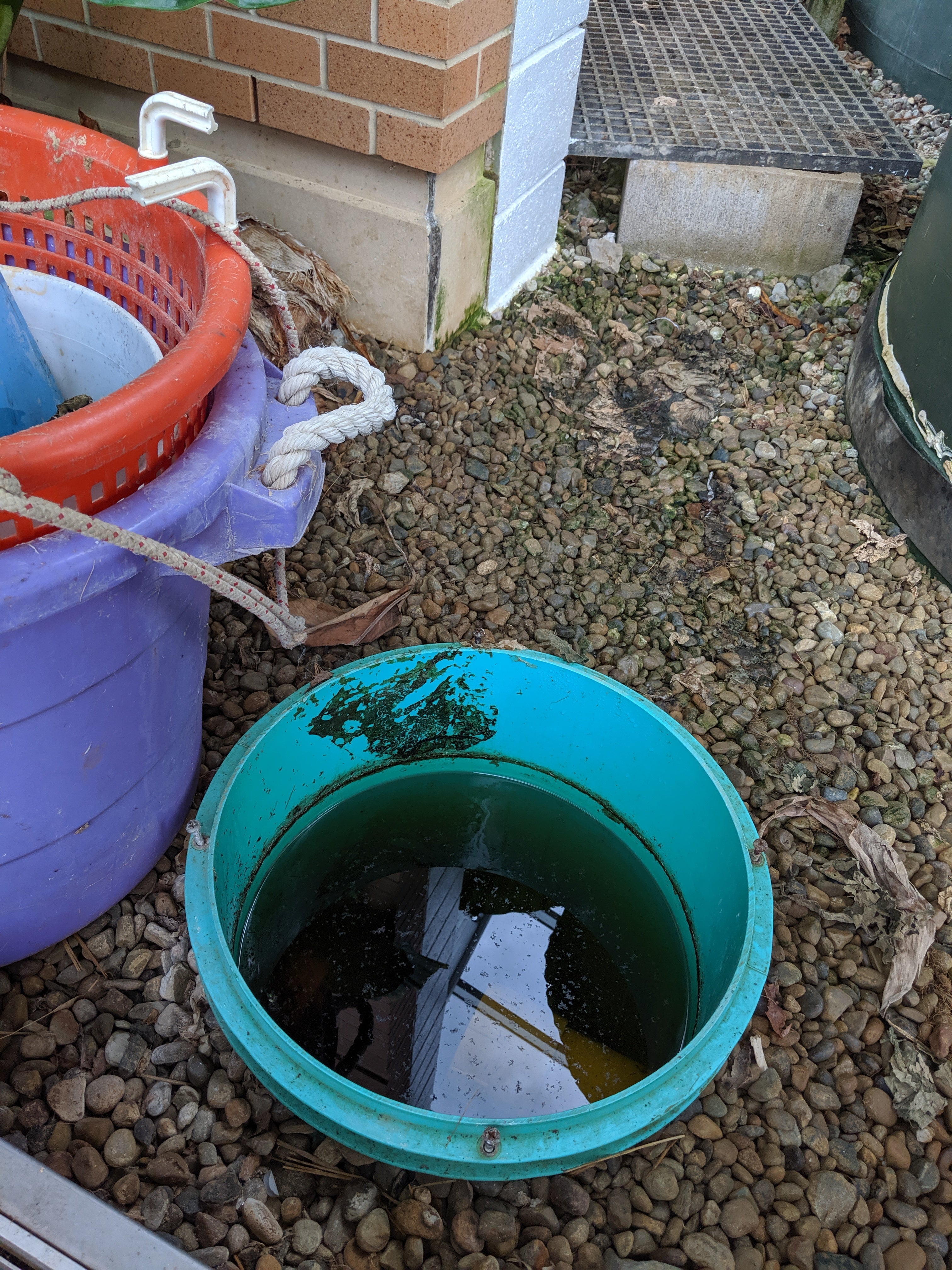 Water from the gravel bed enters the Effluent sump (bottom left) where it is held in a storage tank. When needed for flush water, it is sent through the UV filter (top right).