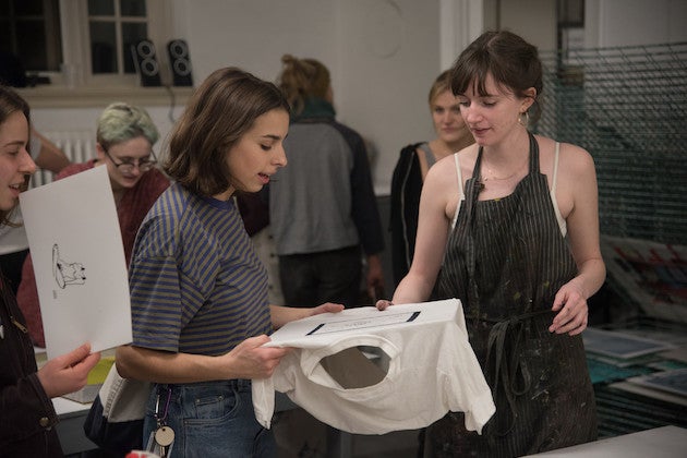 As part of a “Live Print” event, studio art majors silkscreen on T-shirts and tote bags with live music and refreshments.