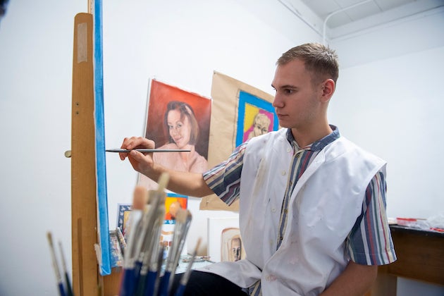 All senior Studio Art majors gain access to a personal studio, and junior majors gain access to a large shared studio space. Here, senior Steven Mentzer ’20 paints in his studio in the Ward building.