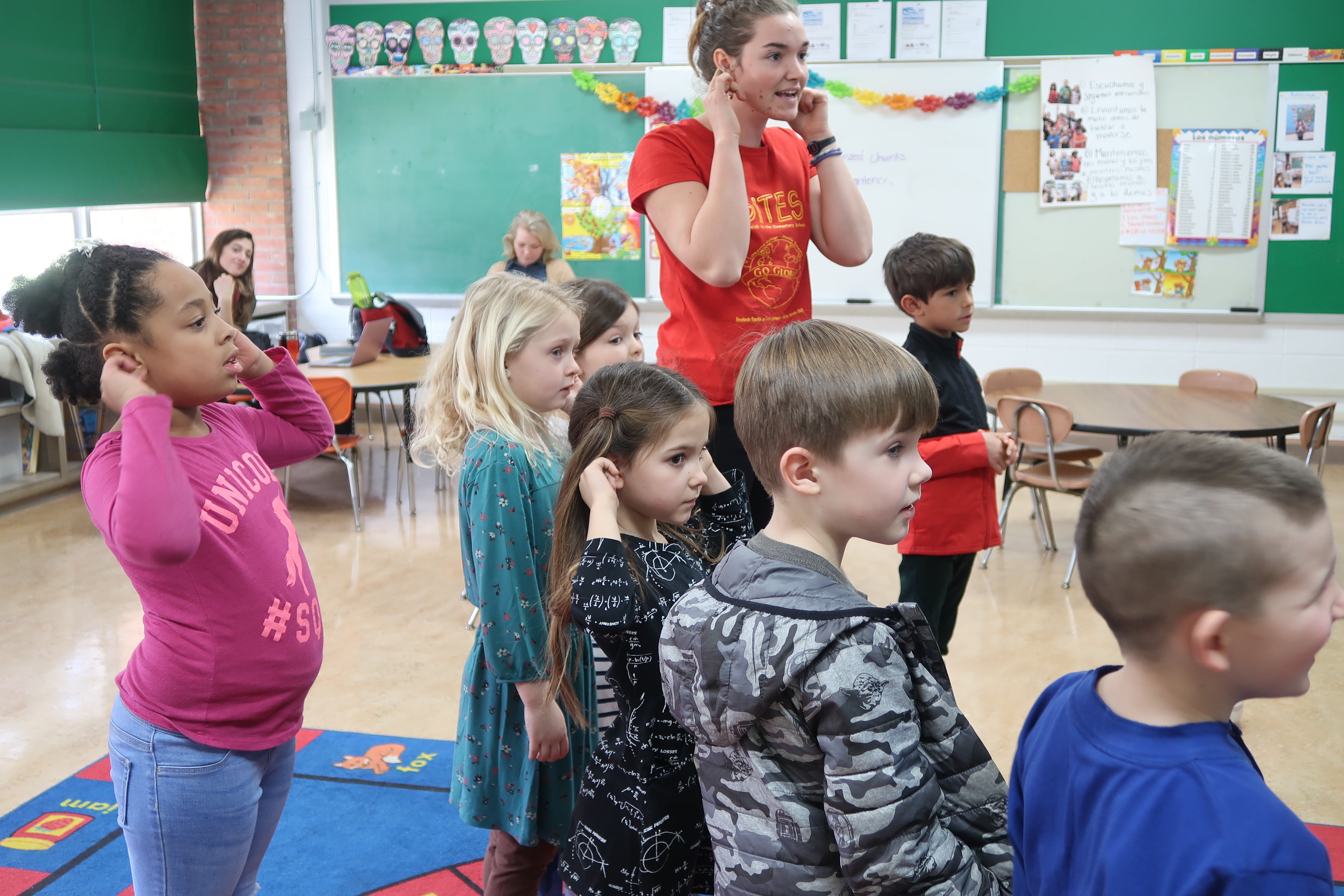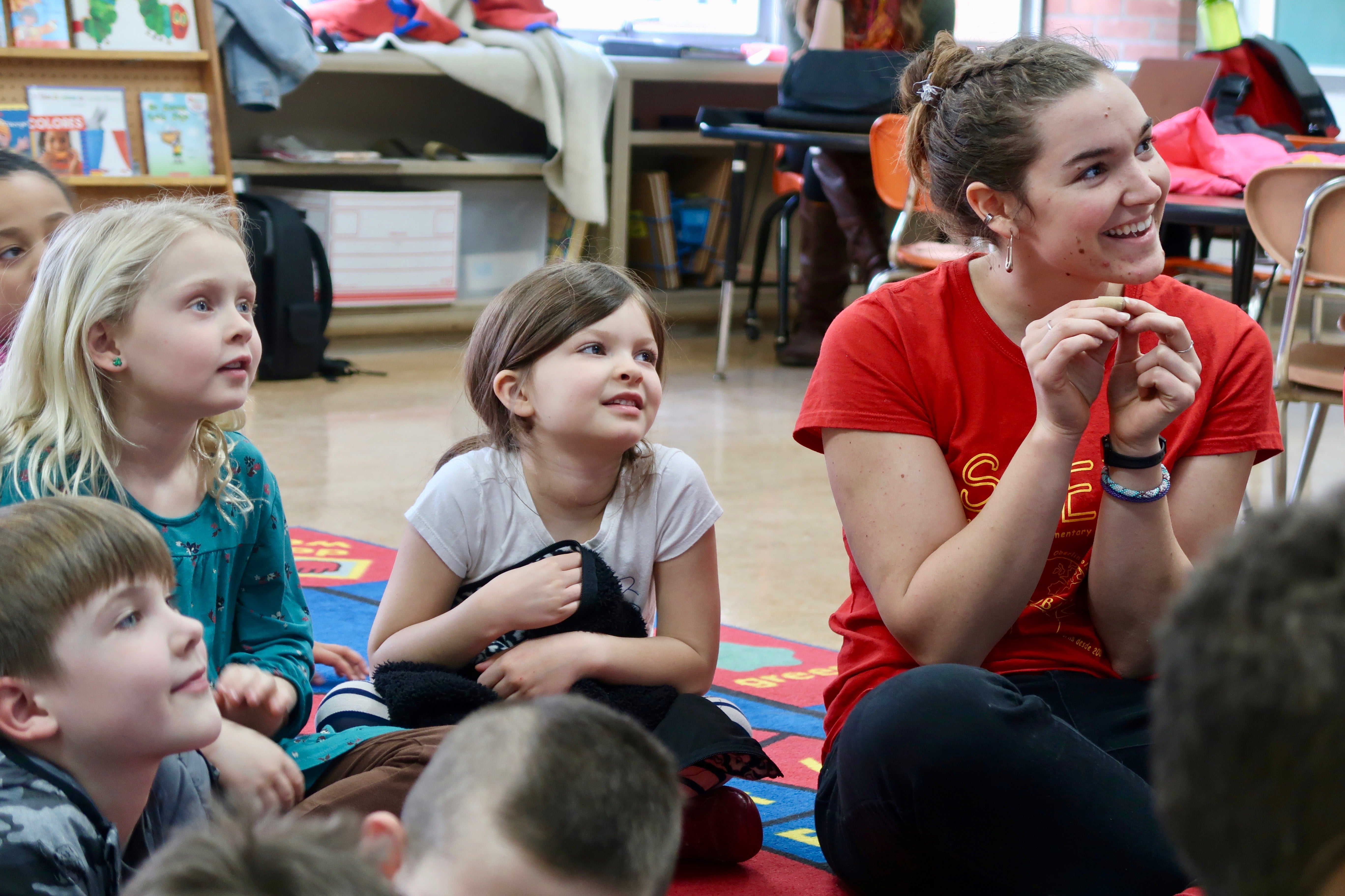 While I hoped, of course, that this Spanish would feel not only fun but also useful to the kids, I knew there weren’t many opportunities for most of the kids to use any Spanish outside of our classes at Eastwood. That was, until I started bumping into different kids around town. A handful of times, I recognized the kids but they didn’t recognize me: I wasn’t wearing my signature red shirt. But when I led with “Hola, ¿cómo estás?” a very shy Jaden would recall ‘Feliz’ when I bumped into him and his mom on Main Street in Oberlin. These interactions reflected the exchange that took place within the SITES program, which was started by Kim Faber when her children were growing up in the school system and she decided to use the resources around her to start the Spanish language program. Her work established a wonderful exchange: the kids at Eastwood get Spanish class and the kids at Oberlin College get mentored teaching experience.