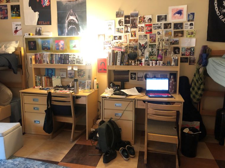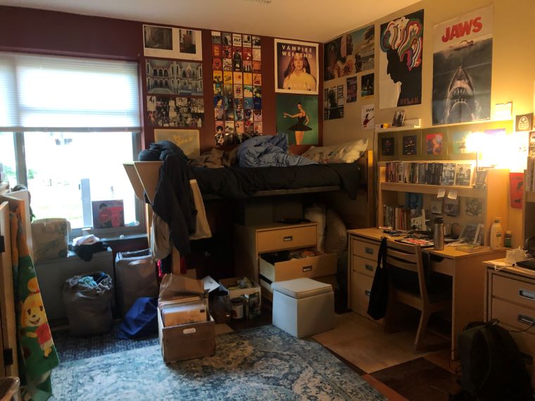 This first photo shows the view from the entrance to the room, with our window, dressers, and my roommate Raghav’s bed. I love his wall of movies that he loves above his bed as well as his crate of records (a few of mine have found their way in there too).