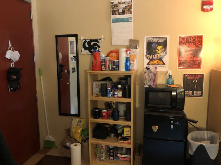 Next to the dressers we have a mirror, a shelf, and our microwave/fridge/freezer combo which we rented from a company affiliated with Oberlin who moved it into our dorm before we got to campus. Also note the cute little tapestry I knitted!