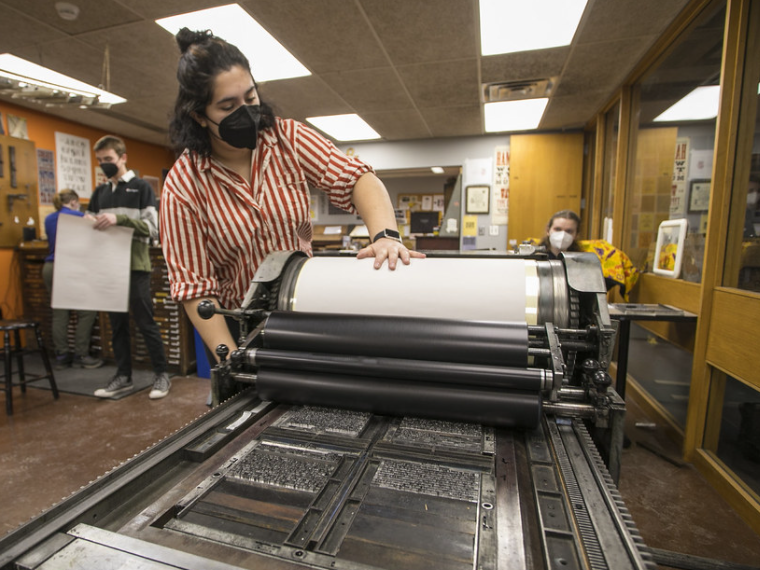 A student prints on the letterpress. Photo Credit: Yvonne Gay