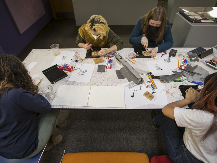 Students cut linoleum blocks. That's me in the sweater vest! Photo Credit: Yvonne Gay