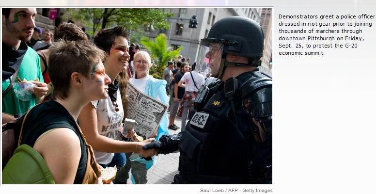 But on a lighter note, that same afternoon an MSNBC photographer caught some friends and me in a rare moment of congeniality with a policeman. (I'm the guy on the left eating a sandwich.)