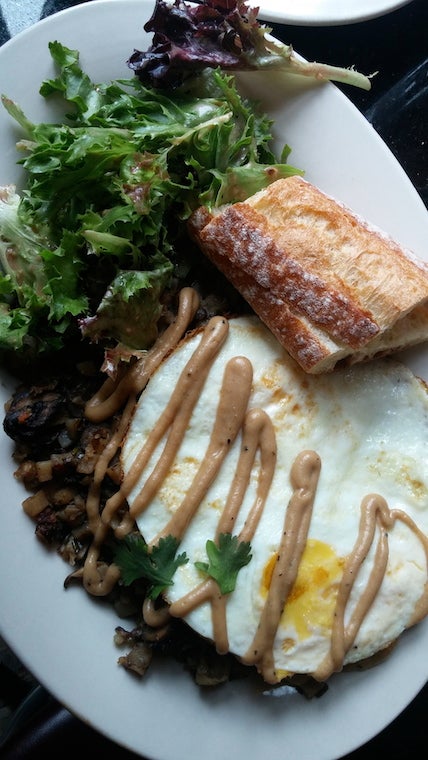 It was so good I got two entrees. Featuring: wild mushroom potato hash topped with eggs and hollandaise, with side salad and baguette.