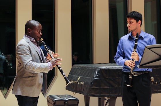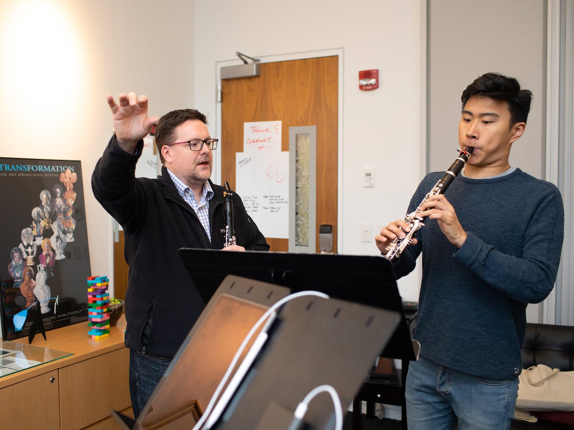 Richard Hawkins guides Dustin Lin, a third-year clarinet performance major from Nashville, Tennessee, during a private lesson.