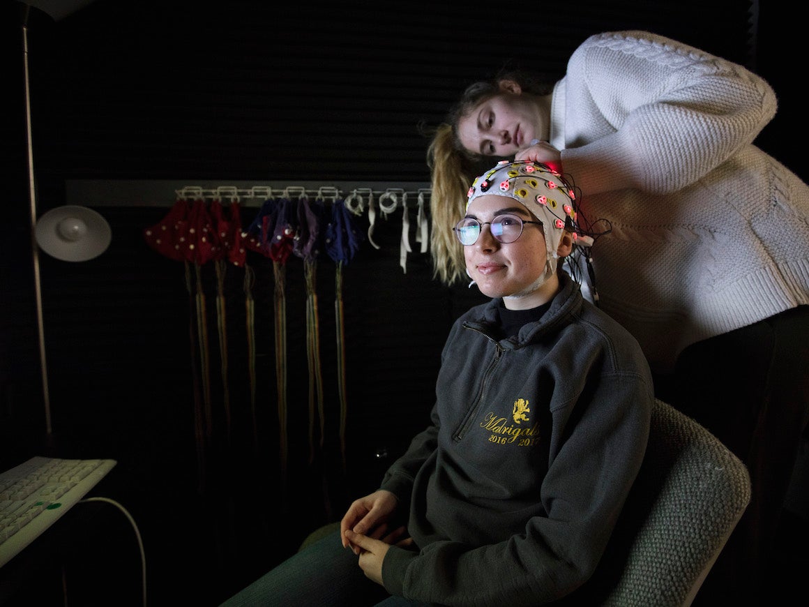 Electroencephalogram is used in a variety of ways in the cognitive sciences to examine the structures and processes that underlie a creature’s ability to think and reason. Here a student adjusts an EEG cap before conducting an assessment.