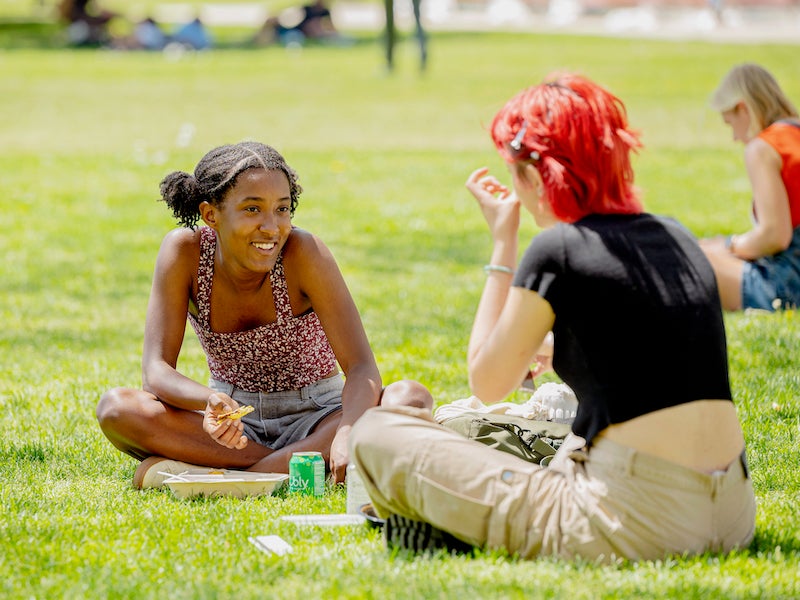 Two students enjoying conversation while sitting on the grass in Wilder Bowl.