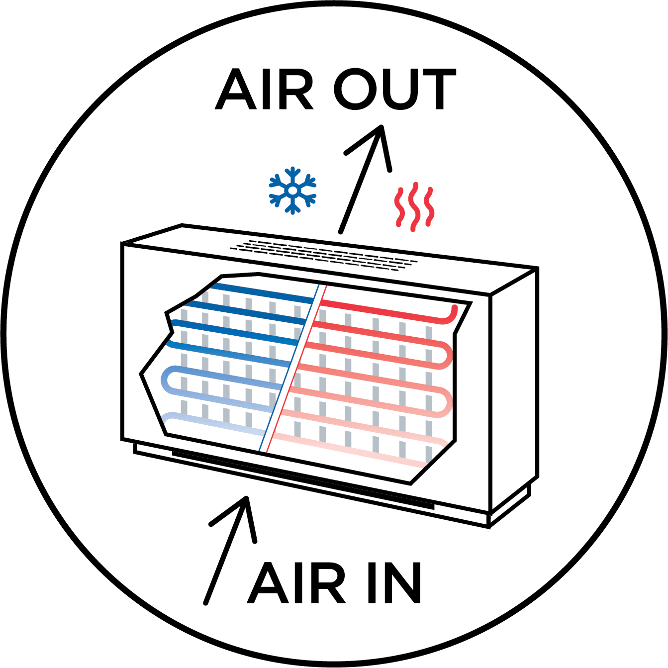 Fan coil units (FCU) can provide heating in the winter by using hot water and cooling in the summer by using chilled water from the all-electric geothermal heat pump system. Air flows into the fan coil (intake) from the bottom and front of the unit. The air is then heated or cooled and blows out of the top of the fan coil (output).