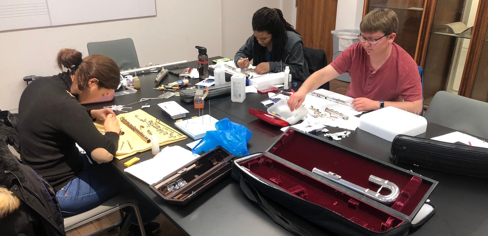 Students Aram Mun, Karisma Palmore, and Will Adams participate in the flute stripping course during winter term. They learn how to disassemble, clean and or repair flutes before reassembling them.