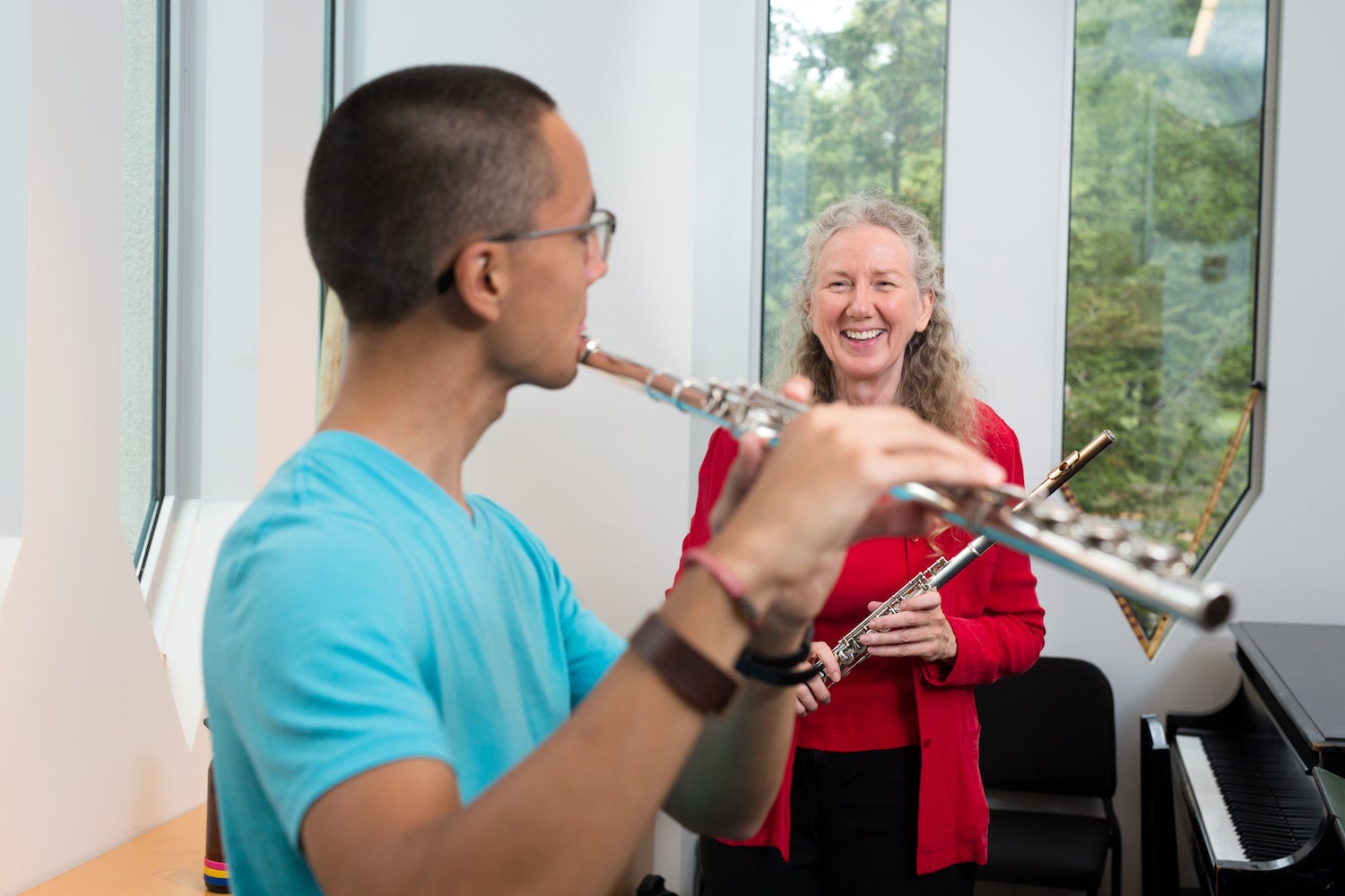 Associate Professor of Flute Alexa Still guides a student through a private lesson in her Bibbins Hall studio.