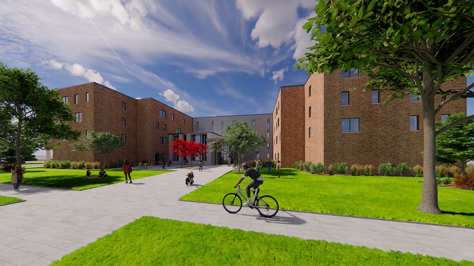 In fall 2025, 400 Oberlin students became the first residents of Woodland Hall, a brand-new residence that consists almost entirely of suite-style living—with a private bedroom for each student—and is conveniently located near Oberlin's athletics complex and Science Center.