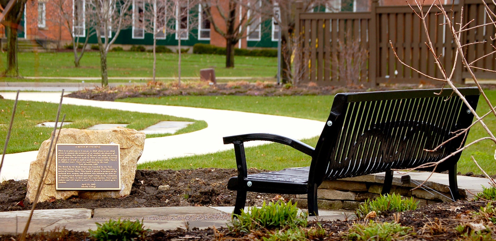 The Bench by Road occupies a circular green space at the intersection of Main and Lorain Streets in Oberlin.