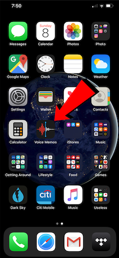 - On your phone, search for the Voice Memos App; it should be one of the default applications that comes with you phone. If you do not see it on your home page, simply swipe down on your home screen and search for it by name or find it in the App Store.