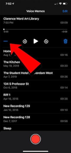 - To send the recording, just press the three dots on the bottom left of the selected recording and hit share (the box with an outward pointing arrow).