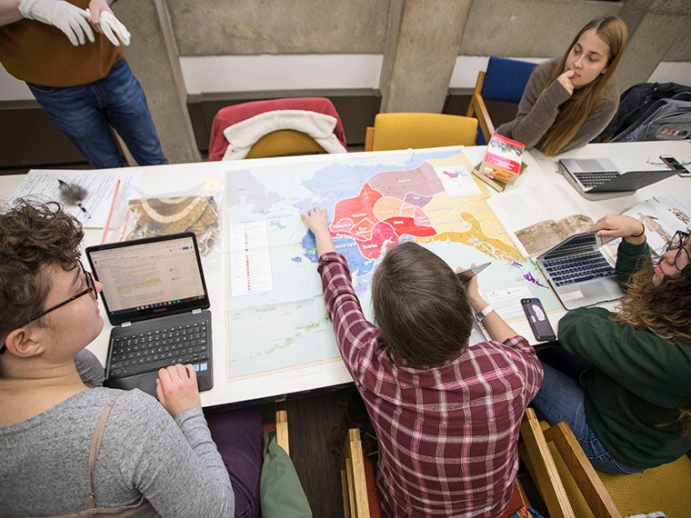 Student researchers lay the groundwork for an exhibition during the 2020 Winter Term project "Practicum in Exhibit Design."