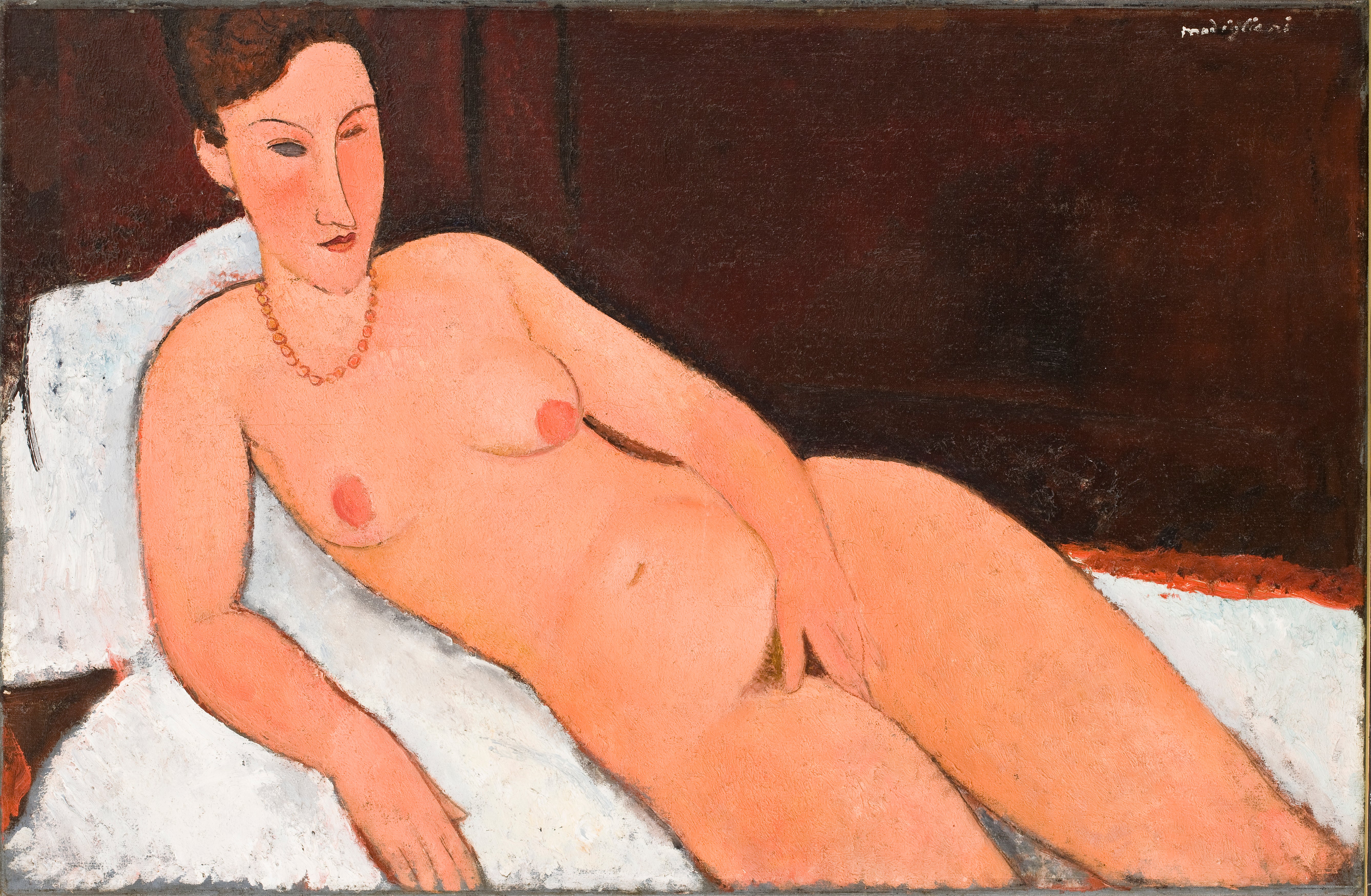Adams cites Amedeo Modigliani’s 1917 painting Nude with Coral Necklace, which depicts an unclothed woman reclining on a chair and touching herself. Through a modern lens, the painting (part of the Allen’s perma- nent collection) can be interpreted as representing unbalanced power dynamics: a “powerful, white, cisgender male artist in his studio who has paid a really poor, most likely very hungry model to lie nude in front of him,” Adams says. “She’s probably cold. She’s probably uncomfortable. She’s being exploited, in a way.”