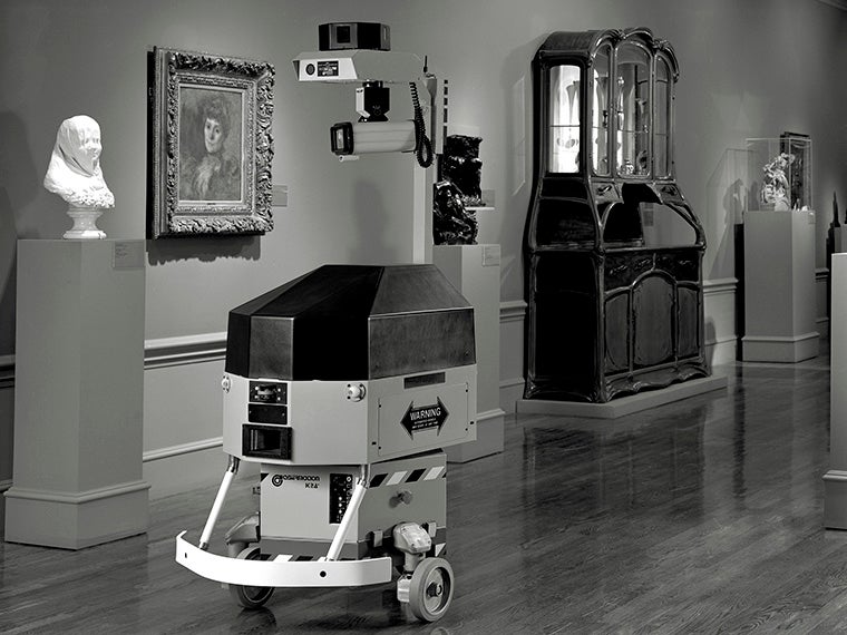 Her second piece is a site-specific installation that draws attention to obsolete technology throughout LACMA, such as the ports once used for telephones, coaxial connectivity, and even robots. “A robot called the Cybermotion SR2 was used in the early 1990’s to assist the LACMA security team,” says Christensen. “The robot did not last long at LACMA, for various reasons, but once the infrastructure was put in place, it was difficult to remove, so ports still stand throughout the galleries.”