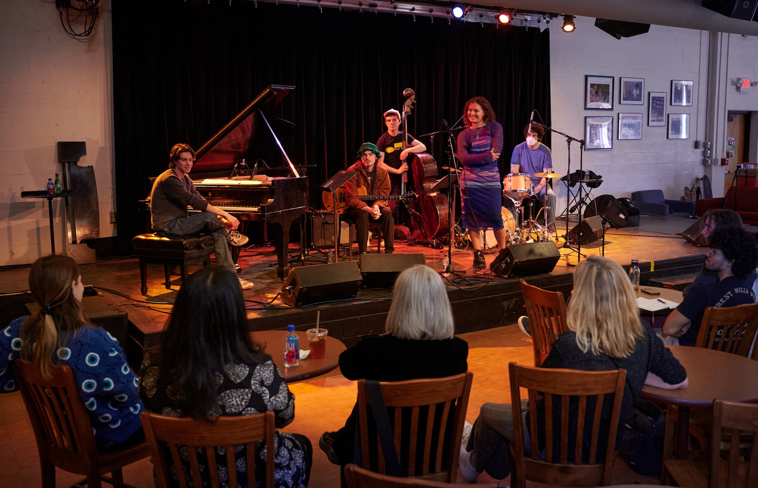 Artemis continued their afternoon at the Cat in the Cream with an ensemble master class. Student-formed jazz groups performed and received feedback from the band members, all of whom are accomplished educators in addition to esteemed performers. Artemis's feedback touched on holistically learning jazz standards,