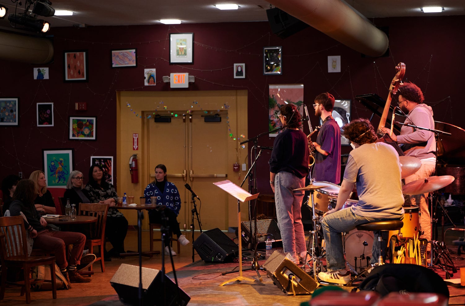 Kicking off their residency, the quintet’s first session with students was held at the intimate Cat in the Cream Coffeehouse—an anchor performing and teaching space for Oberlin’s Jazz Division. The band opened with innovative and complex renditions of Herbie Hancock’s “Dolphin Dance” and Wayne Shorter’s “United,” both arranged by Rosnes. Following the brief set, band members gave introductions before delving into a Q&A session, facilitated by the Oberlin Crimson Collective. The discussion was intimate and casual, addressing a range of relevant topics from maintaining trust on the bandstand to practicing self-care on the road and balancing activism with artistry.