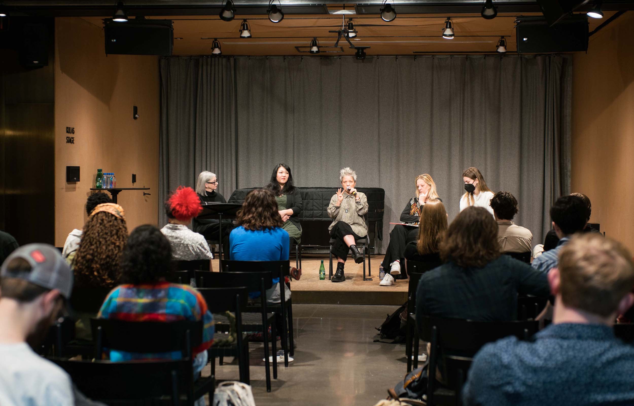 Two student ensembles receive feedback after their master class performances for their peers and Artemis at the Cat in the Cream Coffeehouse. The five members of the ensemble engage in discussion with students during the panel in the Birenbaum.