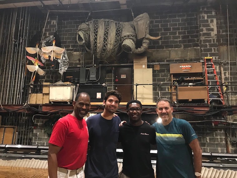 From left, actor Harrison Lee, Jad Kaiss ’19, Jahkeem Wheatley ’19, and management consultant Mitch Weiss ’74 get a backstage tour of The Lion King on Broadway.