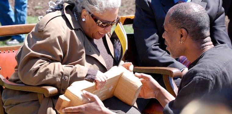 Author Toni Morrison is presented with a stool crafted by Professor Johnny Coleman during the Oberlin Bench by the Road dedication in 2009.