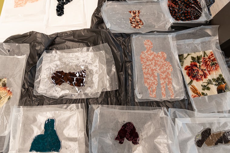 - Assistant Professor of Creative Writing Emily Barton’s advanced creative writing students are completing exercises in writing about real-world people they know and admire. The class is working with Fab Lab instructor Ryan Coorigan to create fabric silhouettes of their subjects. The fabric is dipped in resin and allowed to harden so it can be mounted.