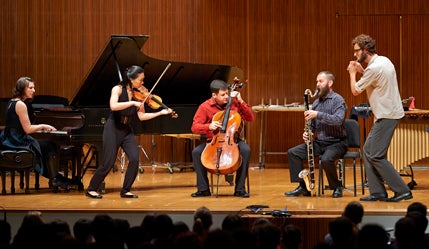 On Friday, October 4, eighth blackbird joined CME in a performance featuring original works by Oberlin faculty members Tom Lopez and Peter Swendsen, as well as composer-in-residence Benjamin Broening.