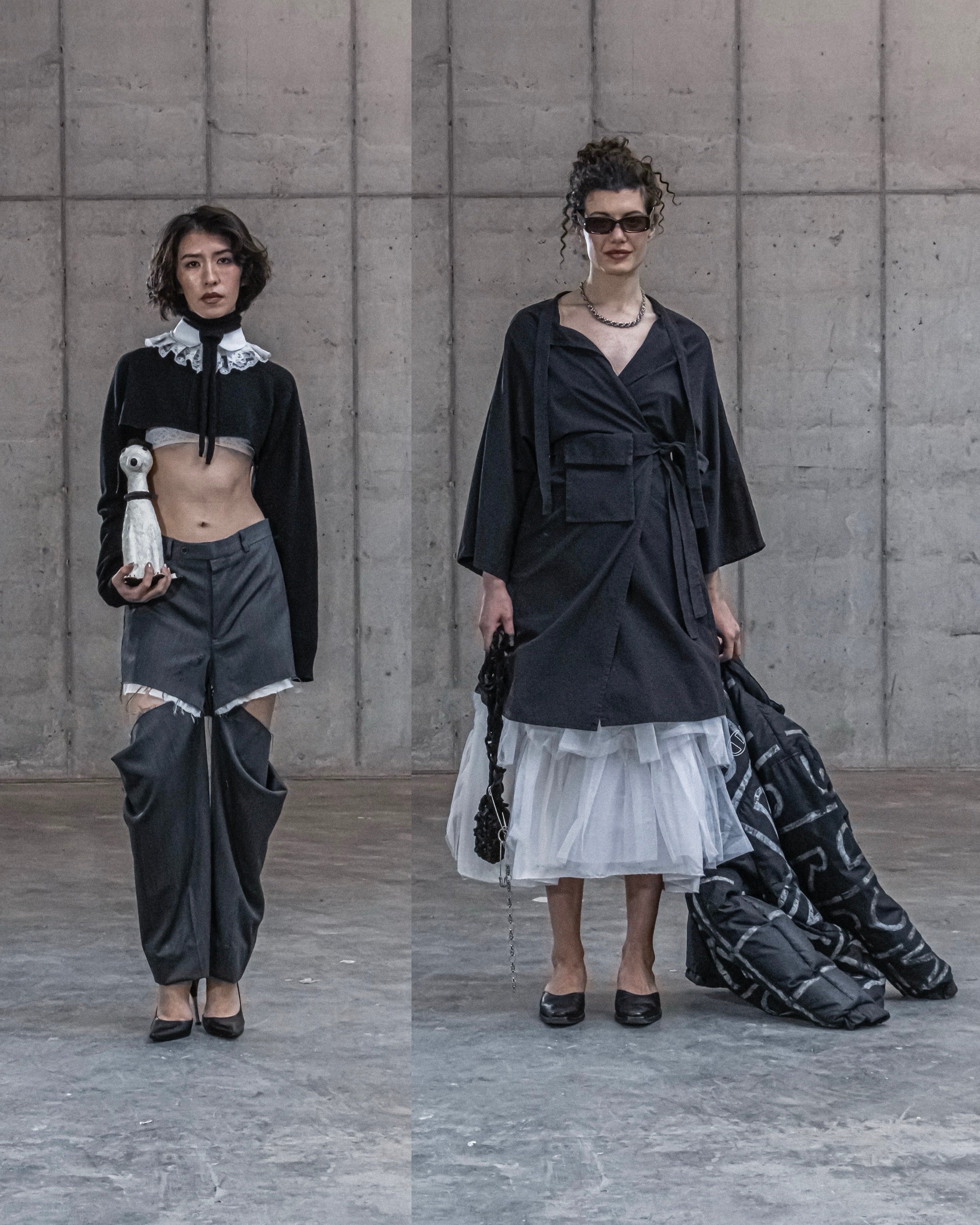 Official Rebrand’s lines are full of inventive, one-of-a-kind hand-painted garments and custom layered pieces made from upcycling fabric. Imagine a skirt made entirely from discarded skirt hems that were stitched together, or a tank top patterned with a scan of a box of testosterone. Or you might pair a tank top ripped into something resembling a rib cage with a jacket covered in an abstract swan painting.
