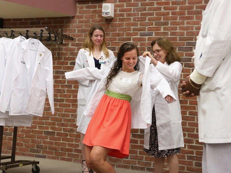 Kate Frost ’15 suits up for rounds at Vanderbilt University, where she will finish her first year of medical school July 28.