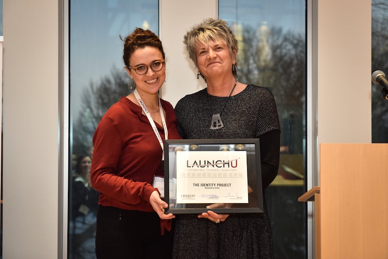 Director of Entrepreneurship Elyzabeth Holford presents a $20,000 award to Alesandra Zsiba ’10 for her LaunchU venture, The Identity Project.