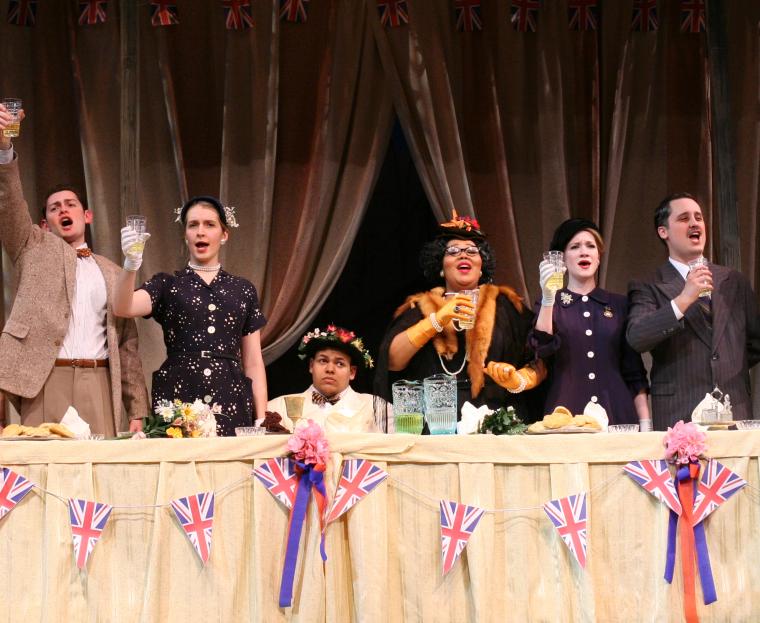 Oberlin Opera Theater presents Albert Herring. Left to right: Daveed Buzaglo ’16 as Sid, Kayleigh Decker ’15 as Mrs. Herring, Joshua Blue ’16 as Albert Herring, Amber Monroe ’17 as Lady Billows, Aubrey Ballaro-Hagadorn ’14 as Miss Wordsworth, and Carlos Enrique Santelli ’14 as Upfold the Mayor