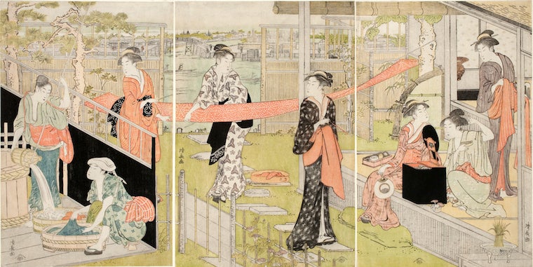 Women Washing and Drying Lengths of Cloth in a Garden beside the Sumida River, a color woodblock print by Torii Kiyonaga, 1788. The print is from the Mary A. Ainsworth collection.