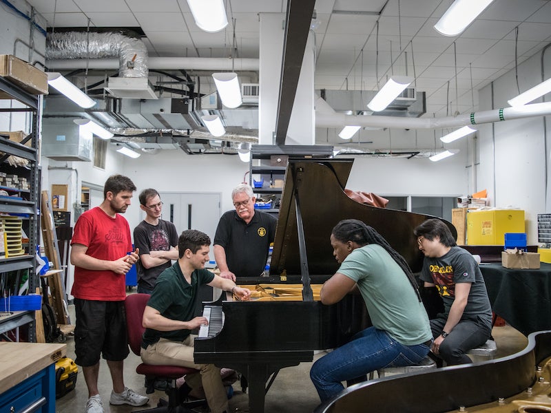 John Cavanaugh (standing, center) works with Oberlin piano technology students in the conservatory's newly remodeled piano shop.