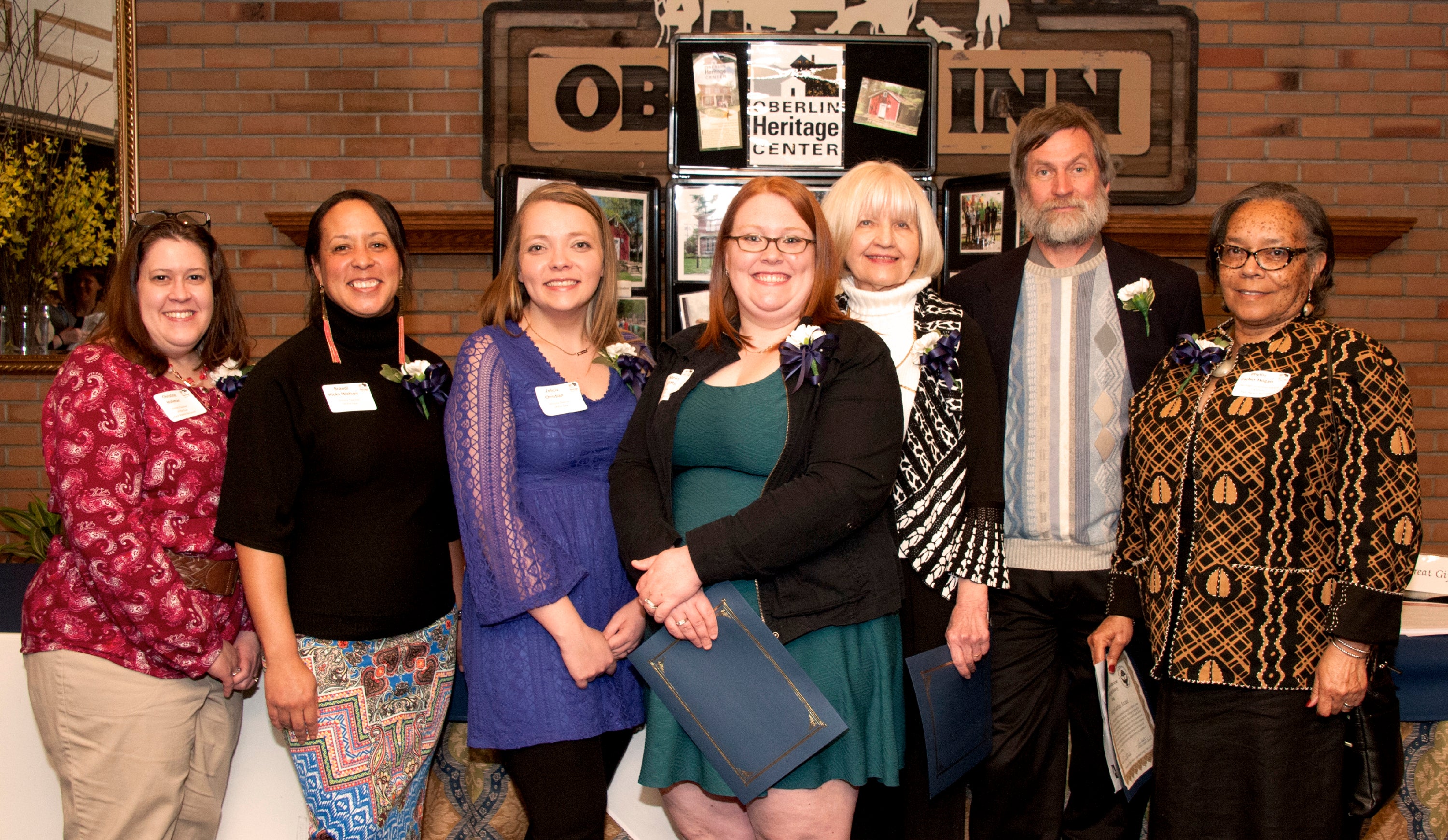 Recipients of the Oberlin Heritage Center’s 15th Annual Community Awards pose for a photo following a gathering of more than 170 members and friends of the nonprofit. (Pictured l-r) History Teachers of the Year Christine Hohman, Brandi Hicks-Watson, and Felicia Christian; Oberlin Heritage Center Volunteers of the Year Melissa Clifford and Eileen Telegdy; Community Teacher of the Year Ken Stanley; and Phyllis Yarber Hogan, president of the Oberlin African-American Genealogy and History Group, recipient of the Heritage Guardian Award. Not pictured are Leo Braid/Oberlin IGA (Business Leader Service Award) and Julia Elrod (Youth Community Service Award).