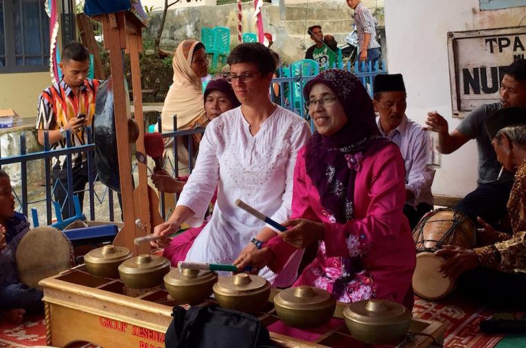 Ethnomusicology professor Jennifer Fraser has led winter term studies in Indonesia with Oberlin students. She is seen here (in white) playing a talempong.