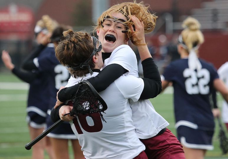 Students in the Class of 2022 walk down a shaded pathway that joins a large tent nestled in a backyard on Forest Street. They will soon be welcomed by their host, President Carmen Twillie Ambar, into a spring day senior garden party.