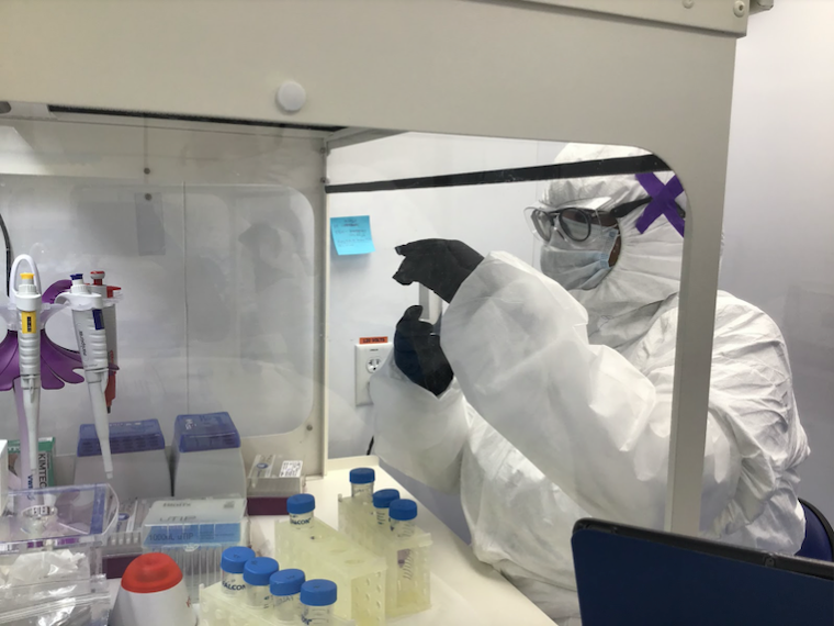 Yemko Pryor ’17 conducts DNA extraction in the ancient DNA lab at Emory University.