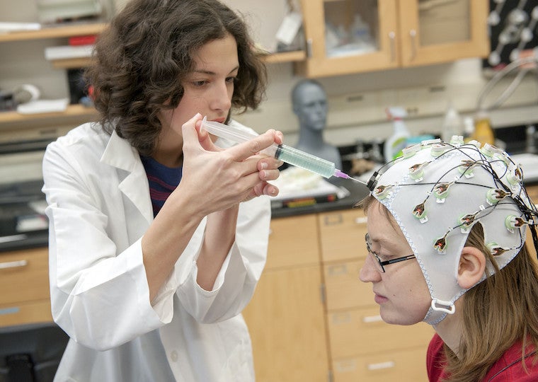 Neuroscience major Zoe Swann ’19 (left) uses electroencephalogram (EEG) in her research project on the computational basis of decision-making and interval timing in the human brain during her senior year at Oberlin College.