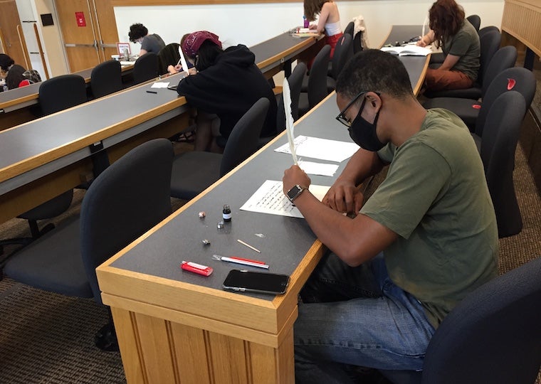 Inside the King Building seminar classroom earlier this semester, Skeehan’s students took long white feathers, removed plumage, and snipped nibs to fashion quill pens. On another day, embroidery hoops and colored floss were used for needlepoint projects.