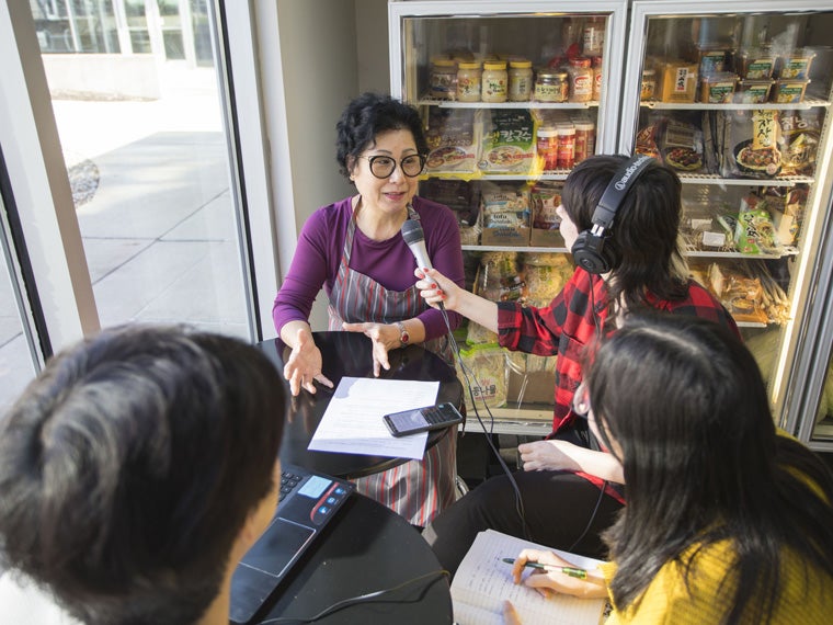 Students interview Kim's Grocery & Carryout owner, Ms. Kim, for their podcast assignment.