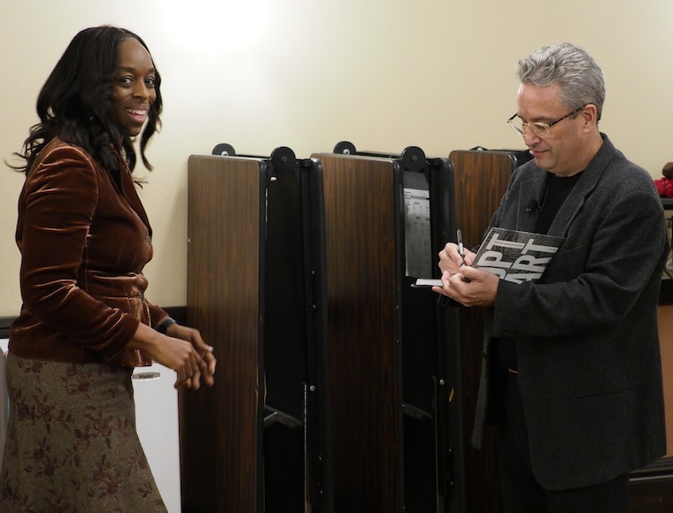Professor Bob Bosch signs a copy of his book for President Carmen Twillie Ambar.