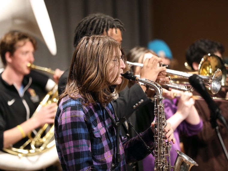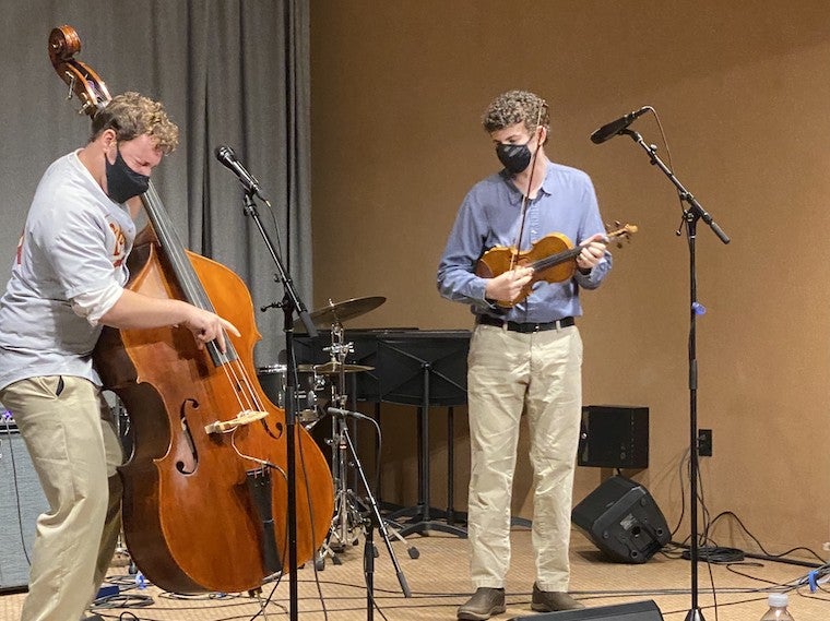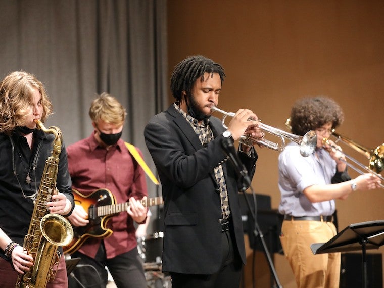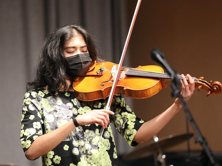 More than 20 scholars in Oberlin’s athletics program, conservatory, and college brought a wide variety of music to the stage. Pieces included I’ll Fly Away by Albert Brumley (performed by Sam Russ ’23, tuba; Zach Strong ’22, Sam Goetz ’23, and Ellie Weinberg '24, percussion; Ethan Pound '24 and Henry Zuccarello ’25, trombone; Ezra Rudel ’23, trumpet; and Nat Lewis ‘23, saxophone). As well as Cello Suite No. 2, Prelude and Courante by J.S. Bach (performed by Rituparna Mukherjee ’21, viola).