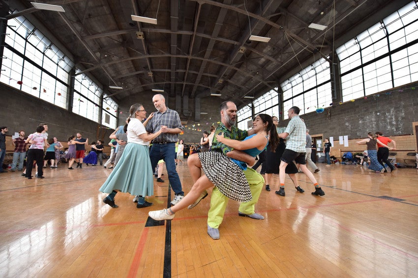Contra dancing is a social dance in which couples stand opposite each other in two lines. A caller, usually working with a group of live musicians, guides new and experienced dancers through a series of moves. The Oberlin Contra Dance Club hosts beginners workshops and dances, including Dandelion Romp (pictured here), in every month of the academic year. Visit the Oberlin Contra Dance Club website for a calendar of upcoming events.