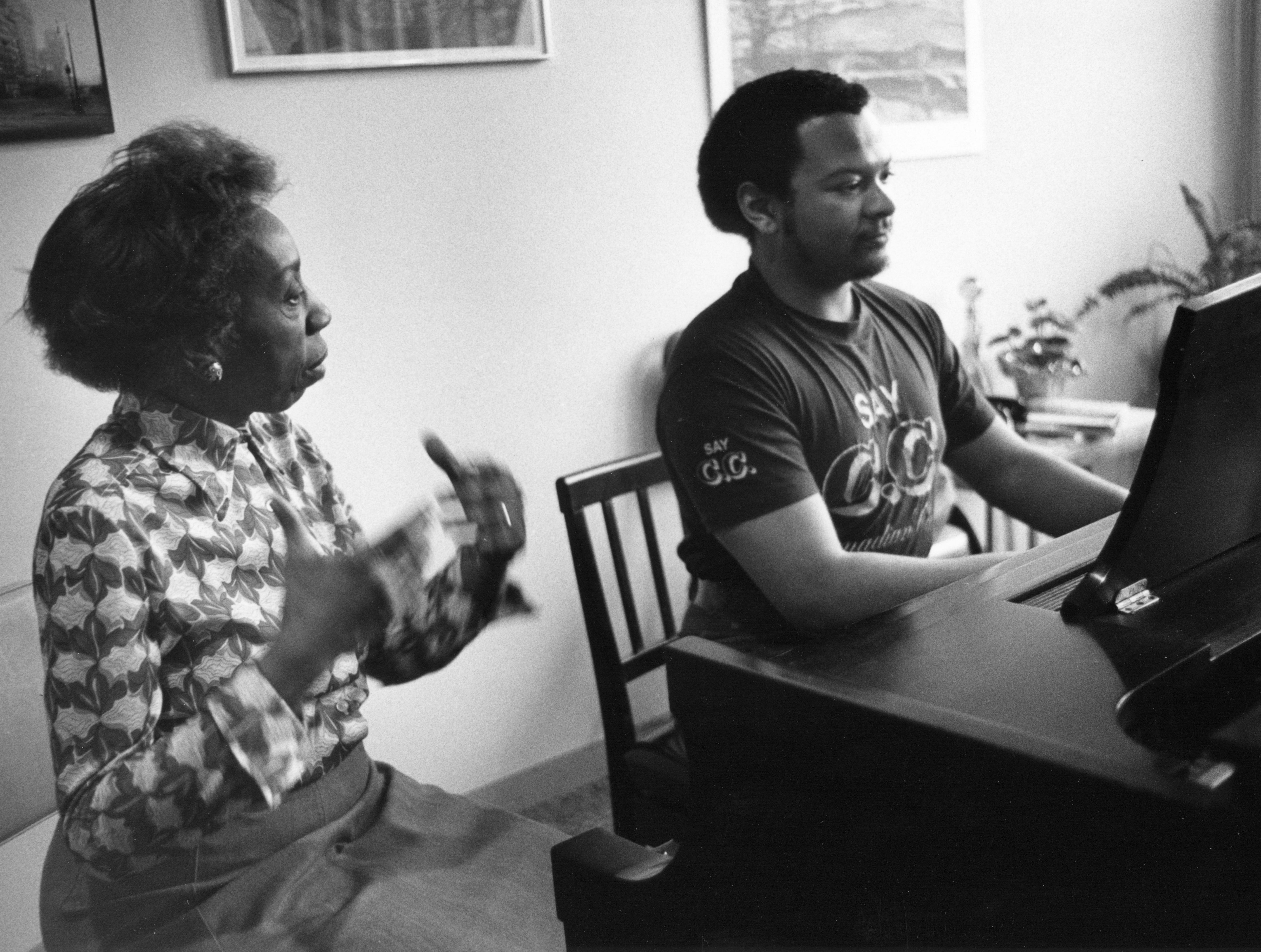 Frances Walker works with student Kevin Sharpe '81 in her Bibbins Hall studio, ca. 1980. Sharpe is now a member of the piano faculty at the University of Florida.