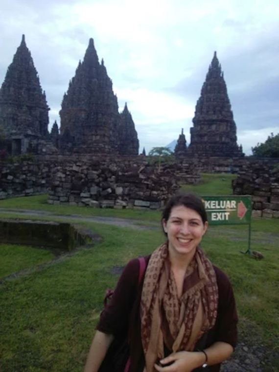 Teresa Tippens ’15 stands in front of a Hindu temple in Yogyakarta, Indonesia, where she lived during her two-year Shansi fellowship after graduating.